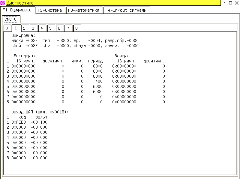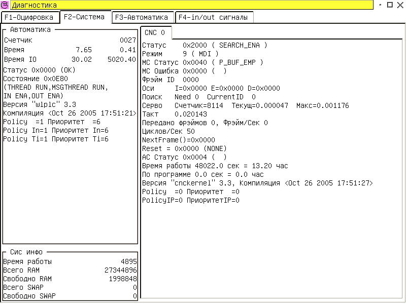F2 - экран отображения состояний переменных интерпретатора, диспетчера контроллера перемещений и автоматики;