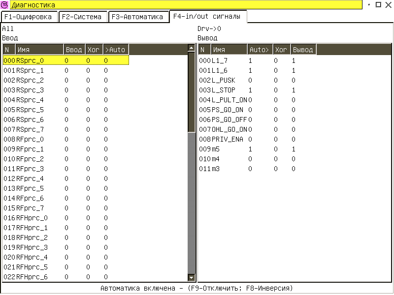 F3 - экран с системной областью памяти электроавтоматики (см. “Описание области сигналов системного драйвера”);